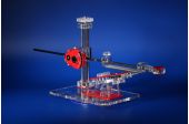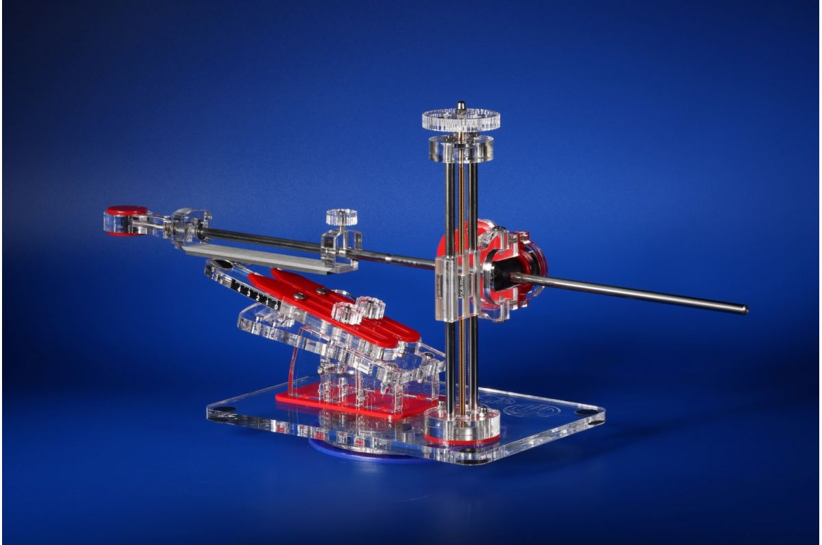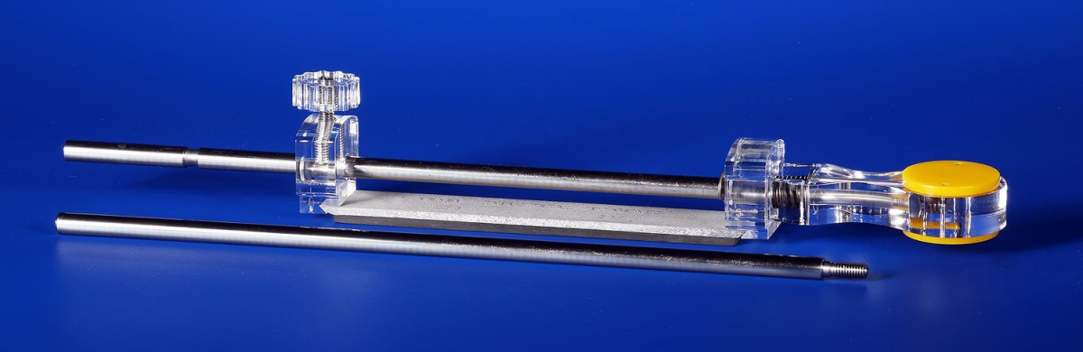 Ich empfehle die Einstellung des Schleifwinkels vom kleinsten Winkel durchzuführen. Was bedeutet das? Wenn vor der Winkel-Einstellung der aktuelle Winkel kleiner als der gewünschte, drehen Sie einfach mit dem Rad im Uhrzeigersinn und erhöhen den Winkel durch das Drehen mit dem Winkelmesser. Sobald der gewünschte Winkel erreicht wird, hören Sie mit dem Drehen auf. Wenn aber der gewünschte Winkel kleiner ist, als der bis zu diesem Zeitpunkt eingestellte, empfehle ich zuerst den Knoten um 1-2 Striche unter den gewünschten herunterziehen, und diesen dann auf den gewünschten Wert zu erhöhen. Auf die gleiche Art und Weise können Sie auch einen eventuellen Mikro-Spielraum der Mutter und der Führungsschraube kompensieren. Da die Mutter an sich in die Gabel mit einem UF-Kleber geklebt wird, fehlt ein Spielraum zwischen der Mutter und der Gabel vollkommen. In 99 % der Fälle müssen Sie keinen Zwischenraum kompensieren, da sich der Knoten des Winkelmessers über den Ständer sehr leicht bewegt und der Stab mit dem Stein, der in den Knoten des Winkelmessers eingelegt ist, alle eventuellen Zwischenräume kompensiert. Es handelt sich eher um eine Zusatz-Sicherung für den Fall, dass Unreinheiten auf den Ständer kommen würden. Falls sich das Rad leicht dreht (zur Kontrolle können Sie mit einer leichten Bewegung über die gerippte Rillenziehung das Rad ggen den Uhrzeigersinn bewegen / Bewegung der Knoten nach unten / und das Rad muss sich durch seine Trägheitskraft mehr als einmal drehen), können Sie alles vergessen, was oben beschrieben wurde. Alle Säulen sind in einem speziellen Konduktor gelagert, der für eine absolute Parallelität der Ständer sorgt. Bis zur Installation der Führungsschraube wird der Knoten des Winkelmessers über die Führungsflächen bei einer Montage-Neigung von 20-30 Grad gegenüber der Horizontale versetzt. Somit ist alles, was oben beschrieben wurde, eigentlich ein Rat für den Fall einer Nichtstandard-Situation.